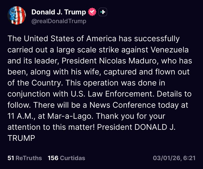 * O presidente dos EUA, **Donald Trump**, afirmou que forças estadunidenses realizaram um ataque militar e **capturaram Nicolás Maduro e sua esposa** — e os teriam levado **para fora da Venezuela**. ([Reuters][1])